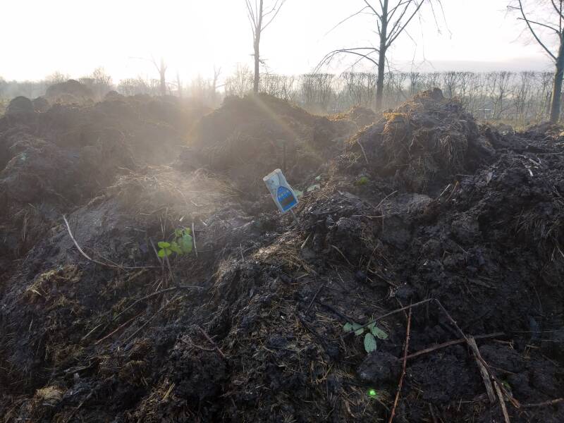 Door het natte najaar stonden half oktober onze koeien al op stal. Dat is zeker een maand eerder dan we gehoopt hadden. Ook in de winter blijft het maar regenen. Zoveel dat ook onze buitenpotstal buiten gebruik bleef en dat ons vee al die tijd al op stal staat. Onze koeien mesten 10 kilo per dag die we direct binden met veel houtsnippers en stro. Dit doen we ruim dus de pot in de stal stijgt snel zeker met 2cm per dag. Net na nieuwjaar, met nog steeds veel regen, hebben we besloten om de pot leeg te scheppen. Als we door zouden potten dan vallen de koeien uit de stal als ze al niet het plafond beginnen te slopen. Alle mest is er inmiddels uit en nu doen de bacteriën buiten in de mesthoop hun werk. Het composteer proces van anaerobe naar aerobe. Dit gaat met veel hitte gepaard (broeien). Vandaag meten we 64C. Mooi gezicht in de ochtend. Ruikt het? Hmmm
